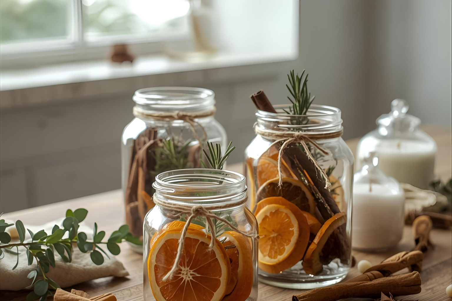 Dried orange garlands. Lavender sachets. Pressed botanicals in simple frames. Sometimes hand-poured soy candles if I have the time.